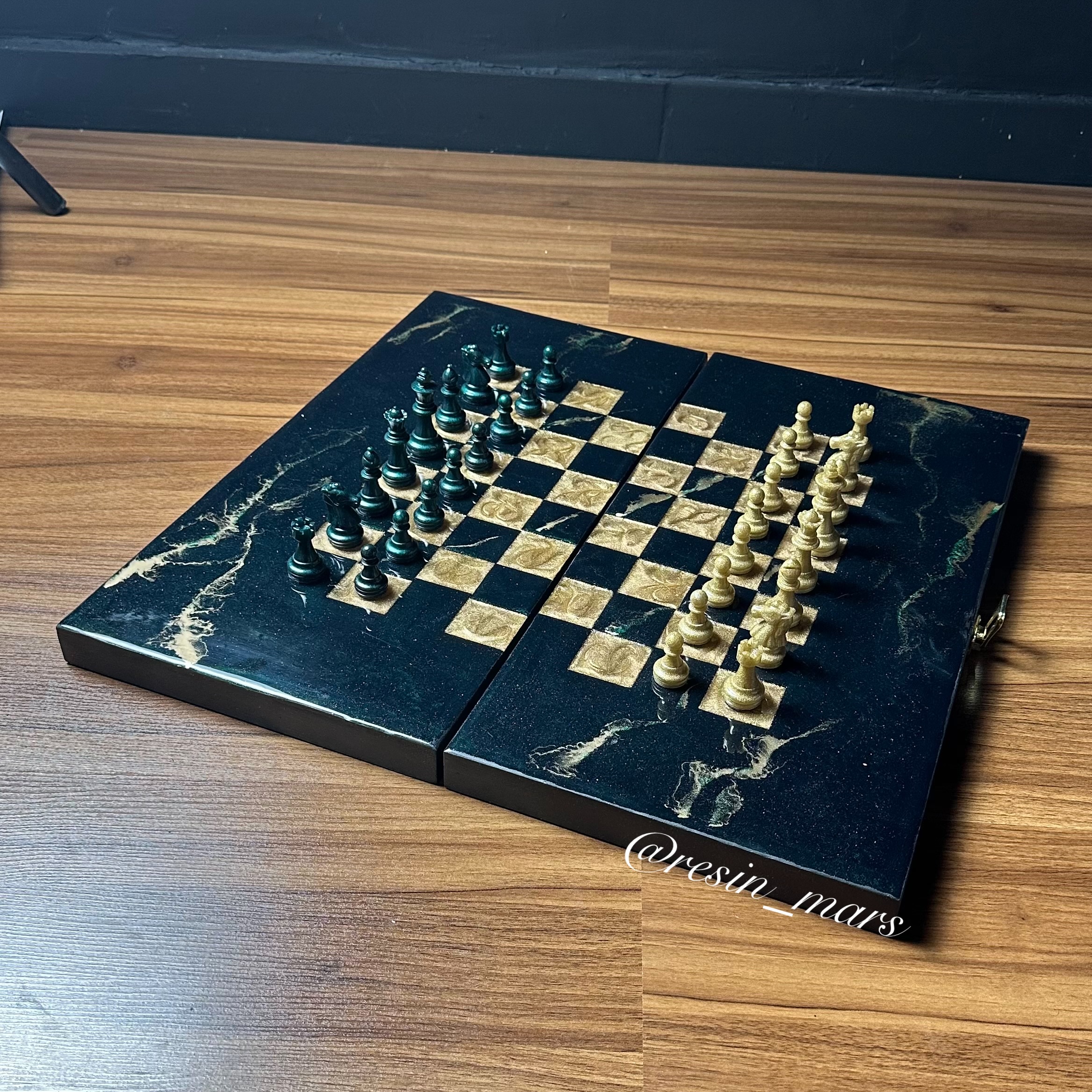 تخته نرد رزینی سبز تیره با خطوط ماربل طلایی